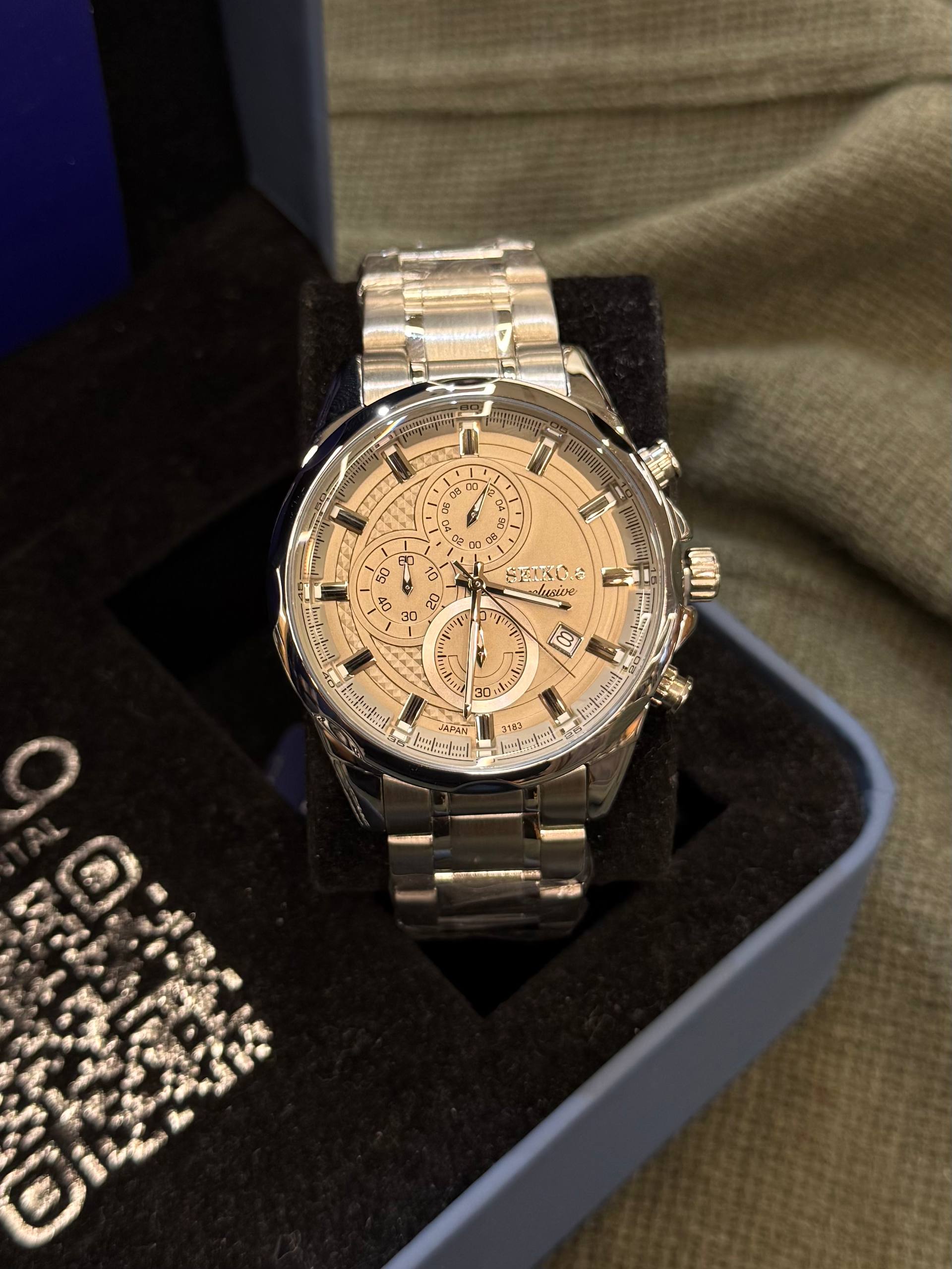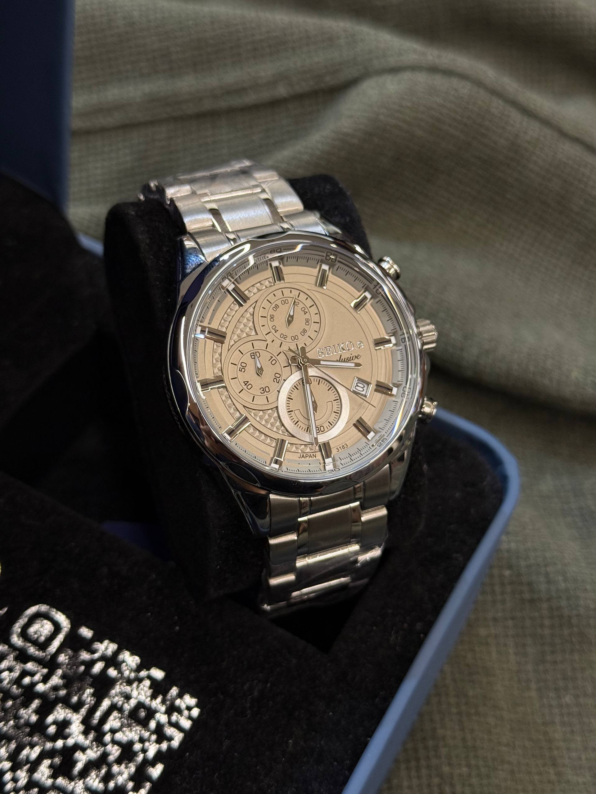 این مدل خاص از سیکو با صفحهای تیره و لاکچری، جلوهای منحصربهفرد ایجاد کرده و ترکیب طلایی در عقربهها، نشانگرها و سابدایالها، حس لوکس بودن را چند برابر میکند. مجهز به سه موتور فعال کرنوگراف و بند استیل براق نقرهای با کیفیت بالا، این ساعت گزینهای بینقص برای استفاده روزمره، مهمانی یا حتی هدیهای خاص است.